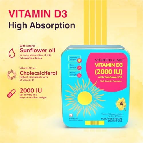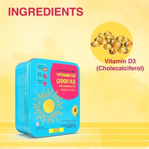 Better absorption Our vitamin D3 supplement is formulated with sunflower oil. This oil is rich in healthy fats that help improve the absorption of vitamin D3, ensuring that your body gets the maximum benefits from the supplement. Cholecalciferol Highest Bioavailable Form of Vitamin D: Our supplement contains cholecalciferol, the most effective and bioavailable form of vitamin D. This form is readily absorbed by the body and converted into its active form, providing quick results. Bone and Muscle weakness Each capsule of our vitamin D3 supplement provides 2000 IU of vitamin D3. This dosage is ideal for supporting bone and muscle strength, reducing the risk of fractures and falls, and promoting overall health.Vitamin D3 helps the body absorb calcium and phosphorus, which are essential for building and maintaining strong bones. It can reduce the risk of fractures and falls, especially in older adults. Vitamin D3 also plays a role in regulating bone mineralization and preventing bone loss. muscleEnhances Muscle Function Vitamin D3 is important for muscle function and strength, as it helps regulate calcium levels in the muscle cells. It can improve muscle performance and reduce the risk of muscle weakness and atrophy. Low levels of vitamin D3 have been linked to muscle pain, weakness, and fatigue.