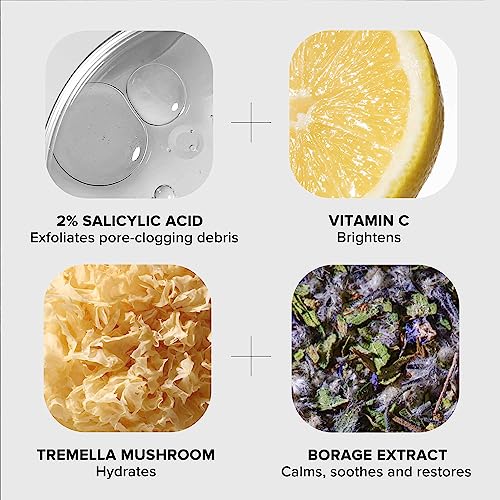 KEY INGREDIENTS INCLUDE: Borage Extract to calm, sooth & restore skin. Tremella Mushroom hydrates and maintains skin’s natural pH. 2% Salicylic Acid (BHA) exfoliates pore-clogging debris. Vitamin C visibly brightens and protects against free-radical damage.