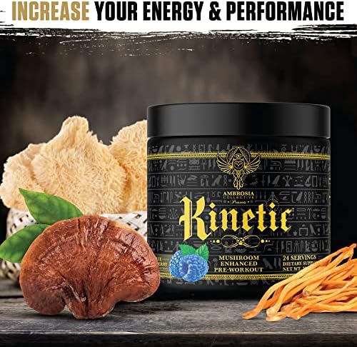 Ambrosia Kinetic Organic Preworkout, Mushroom Enhanced Natural Pre Workout Supplement, Nootropic Superfood Powder for Energy (Blue Raspberry)