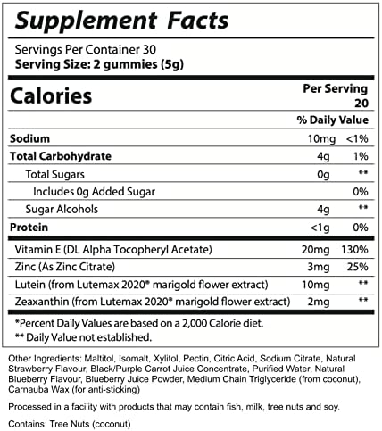 Lutein Eye Support Gummies: Each serving of KalaVita eye health vitamins contains 10 mg of lutein and 2 mg of zeaxanthin and other nutrients important to healthy eyes, including Vitamin E, Zinc. 30-day supply, 50 gummies per bottle.