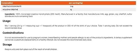 BIOTECH Creatine Monohydrate 300 g – Do you care about increasing muscle volume, increasing strength and efficiency of the body? If yes, then also you are wondering about the appropriate supplementation. To this end, the Biotech USA brand presents Creatine Monohydrate – a product containing 100% creatine monohydrate. With it, you’ll be able to accelerate the anabolic process in the muscles, stopping them from the unwanted catabolic process. You will provide your body with more energy, which can also have a positive effect on extending your workouts, and what is important, you will be felt even more powerful! The 100% Creatine Monohydrate dietary supplement by BioTech is an excellent proposition for every lover of strength, endurance and speed sports. The level of advancement does not play any role here. The product’s effectiveness will support both a novice amateur and a professional athlete. Usage: Mix 1 serving (3.4 g = 1 measuring cup = 1 teaspoon) of the product in 300 ml of the drink of your choice. Take 1 serving daily. Do not exceed the recommended dose