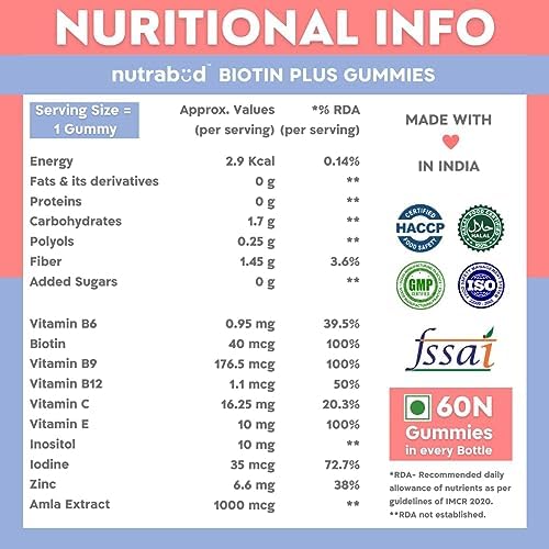 SAFE & 100% VEGAN – gummies are safe to consume for all women and men across age groups, suitable for all hair types. Our gummies are free of most common allergens so be worry free while consuming. All our products are produced in certified facilities- FSSAI, WHO-GMP, HACCP, ISO, HALAL. Each bottle contains 60 gummies, consume 1 gummy daily for 3 months for best results.