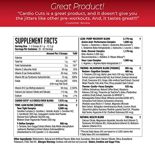 Quicker Recovery: After an aggressive workout, Cardio Cuts has you covered. Packed with Glutamine, BCAAs, and a thorough Rejuvenation Complex, Cardio Cuts supports quicker recovery and repair. Cardio Cuts tastes great and mixes well.