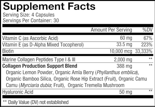 10,000 mcg biotin & organic blend: This solution features 10,000 mcg of biotin per serving and offers amino acids. The formula also includes an organic blend of fruits, herbs and mushroom including amla berry, rose hips extracts and lemon powder. Codeage marine collagen capsules are designed for both men and women.
