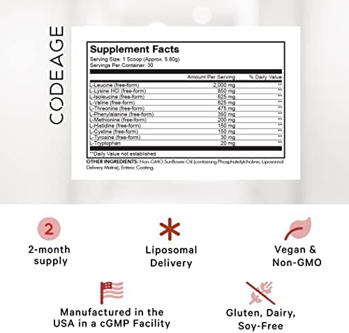 This BCAA powder (branched-chain amino acid) and EAA powder (essential amino acid) supplement utilizes a liposomal delivery system to help enhance the bioavailability of the amino acids. Codeage EAA supplement formula provides L-Leucine, L-Lysine HCL, L-Isoleucine, L-Valine, L-Threonine, L-Phenylalanine, L-Methionine, L-Histidine, L-Cystine, L-Tyrosine in their free-form, as well as L-Tryptophan.