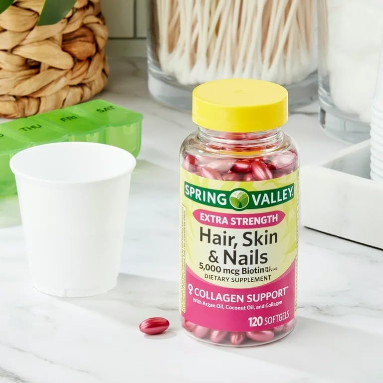 Convergence Extra Strength Biotin Hair, Skin & Nails Dietary Supplement, 5,000 mcg are dietary supplements that promote collagen support. Each serving provides 5000 micrograms of biotin, as well as 14 key vitamins and minerals, in addition to argan oil, coconut oil, and collagen. The suggested adult dosage is three softgels daily, preferably with a meal. You can rest assured that Convergence Extra Strength Biotin Hair, Skin & Nails Dietary Supplement, 5,000 mcg are produced with strict quality guidelines and are backed by our quality guarantee.