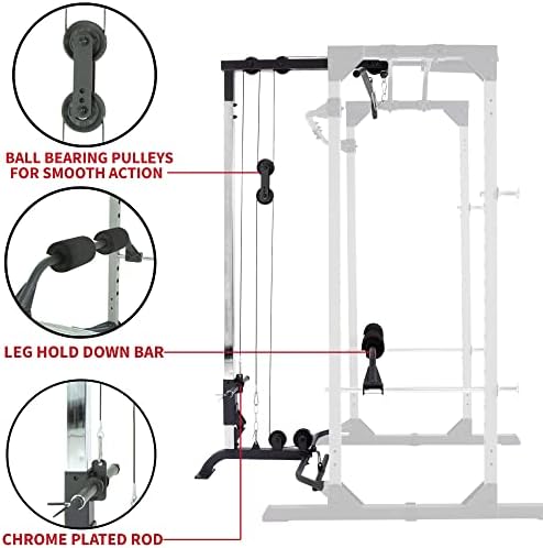 Includes high and low row pulley systems. High tensile strength nylon coated cable. Easy glide 2” x 2” chrome guide rail for smooth operation. Includes one 39” bar and one 20” low row bar attachments with foam grips