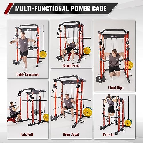 EXCELLENT QUALITY: Made of 50 X 70mm commercial steel square frame with a thickness of 2mm. The product weighs 255lbs with 16 reinforcing tabs which increase its stability during training. Cage size – 66.9″L×63″W×84.3″H | Max user weight – 400 lbs. | Max capacity on Safety bar – 700lbs.|Max capacity on cable 300lbs.| Max capacity on dip bar – 350 lbs.| Max capacity on pull-ups bar – 400 lbs.