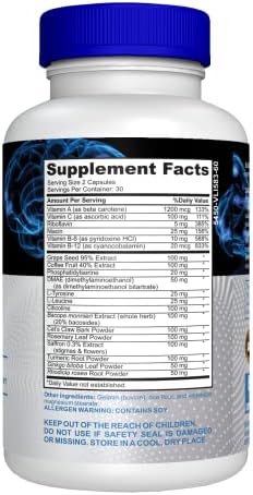 Vitamin A (as beta-carotene) Often found in wellness supplements, Vitamin A is associated with overall well-being, including vision and skin health.* Vitamin C An antioxidant frequently included in wellness regimes to contribute to a balanced nutritional profile.* Riboflavin Integral for a balanced diet and often included in multi-vitamins for its contribution to overall wellness.* Vitamin B-6 (as pyridoxine HCL) Commonly found in wellness supplements aimed at nutritional support and metabolic functioning.* Vitamin B-12 (as cyanocobalamin) Popular in supplements designed to support daily wellness and energy levels.* Grape Seed Extract Renowned for its rich antioxidant content and commonly featured in wellness supplements.* Bacopa Monnieri An herb that has historical roots in Ayurvedic practices focused on mental balance and calm.* L-Tyrosine An amino acid that serves as a building block for proteins and is commonly found in wellness and energy-support formulas.* L-Leucin A popular amino acid that often appears in wellness supplements targeting physical performance and muscle wellness.* Rosemary Leaf Powder Known for its aromatic properties and often included in supplements aimed at promoting overall wellness.* Ginkgo Biloba Leaf Powder A botanical often included in wellness supplements aimed at cognitive balance and overall mental wellness.* Rhodiola Rosea Root Powder May enhance cognition, learning, memory, reduces stress, and improves physical and mental fitness.*