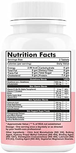 Glutathione with Super foods may help in maintaining youthful skin by preventing the breakdown of elastin and collagen due to oxidative stress. L Glutathione Even Skin tablets work on the deeper layer of our skin where melanin is formed. This detoxes your skin and helps in reducingtoxins and blemishes. Super berries and vitamin C is an antioxidant that supports the immune system and helps produce collagen, a key protein for healthy skin.Help your skin look healthier with L-Glutathione for Healthy & Radiant Skin for Women. Improve your skin elasticity and hydration and produce new skin cells with this skin hydration support supplement. L-Glutathione is a powerful antioxidant that plays a key role in our body, protecting us from harmful free radicals. Glutathione also supports the natural production of collagen for skin health, and helps to maintain skin elasticity.