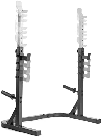 Take control of your strength-training routine Forged from durable steel, this squat rack can support up to 310 pounds. This rack is meant for weightlifters of all experience levels. Perform traditional squats, rack pulls, deadlifts, and a variety of other compound exercises to develop lean muscle across your entire body. Dual storage pegs allow you to store and organize your own 2” weight plates (sold separately) and keep them within reach as you exercise. Adjust both the upright bar holds and safety spotting arms to fit your frame, lifting style, and exercise preferences. Enjoy a comfortable and secure workout in the comfort of your own home . These bar holds are 7-foot barbells, which are sold separately. Use with the Bench (sold separately) to perform chest press and a variety of other combination exercises. Invest in better home exercise with the versatile Squat Rack.