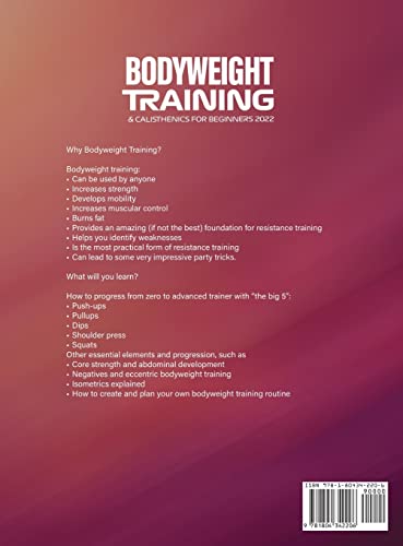 Why Bodyweight Training?Bodyweight training: – Can be used by anyone- Increases strength- Develops mobility- Increases muscular control- Burns fat- Provides an amazing (if not the best) foundation for resistance training- Helps you identify weaknesses- Is the most practical form of resistance training- Can lead to some very impressive party tricks.What will you learn?How to progress from zero to advanced trainer with “the big 5” – Push-ups- Pullups- Dips- Shoulder press- SquatsOther essential elements and progression, such as- Core strength and abdominal development- Negatives and eccentric bodyweight training- Isometrics explained- How to create and plan your own bodyweight training routine