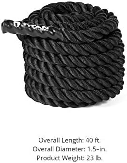 DIMENSIONS: Titan Battle rope measures at 40 feet with a 1.5-in diameter. The handles have an extra coating to prevent the rope from fraying. Which will greatly increase the life of the battle rope and allow it to be used outdoors.