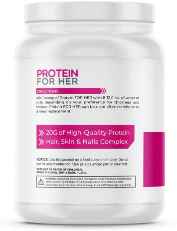 Protein for Women: Unfortunately not all protein was formulated with everyone’s goals in mind. That’s why we combined Biotin, CLA, and whey protein together to make an effective protein blend for women that actually provides results.Fuel Your Goals: When your hangry, you’re probably not having a good time. That’s why we formulated Protein for Her with CLA, to keep you fueled all day long. Skip the protein bar and mix up our delicious Protein for Her protein powder for the perfect healthy snack.Hair, Skin, and Nails for Women: When you exercise, you might notice a difference in the health of your hair, skin, and nails. That’s why we included biotin in Protein for Her, to give your hair, skin and nails the support they need as you crush your fitness goals.Ideal Snack: Protein for Her is the ideal snack! Our delicious protein contains 110 Calories, 3g carbs, and 20 g of protein per serving to keep you going all day long.