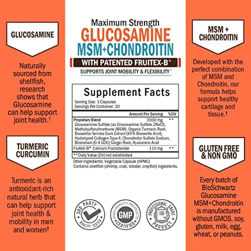 Made in the USA, professionally formulated, and third-party tested: BioSchwartz glucosamine MSM chondroitin capsules are formulated by professionals and manufactured in the USA following strict GMP guidelines – each and every batch is third party tested to guarantee ultra high purity, potency, and quality