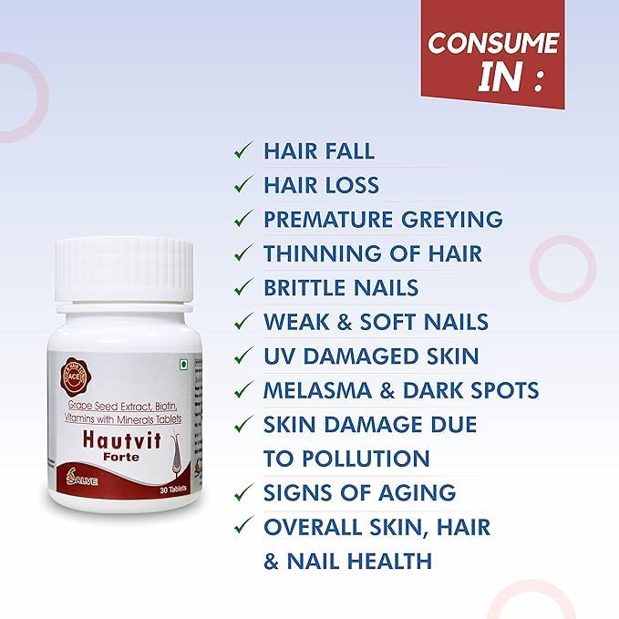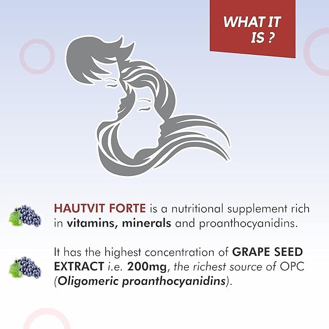 Hautvit Forte Supplement with potent 10000 mcg Biotin, Iron & Zinc Immunity Booster For Hair Health, Glowing Skin, Brittle and Discolored Nails For Men & Women – 30 Tabs . HAUTVIT FORTE Tablet is a dietary food supplement suitable for conditions such as hair fall and loss, premature greying of hair, and melasma. It contains Grape seed extract, Vitamins, and Minerals as active ingredients that help to support healthy hair, skin, and nails. Grape seed extract is the richest source of Oligomeric Proanthocynidins (OPC’s) that may help to block the production of DHT, Dihydrotestosterone a hormone that causes hair loss and prolong the anagen phase. OPC also helps to boost collagen synthesis that reduces the visible signs of ageing. Calcium pantothenate reduces skin hyper pigmentation. Iron is helpful for patients of Telogen Effluvium (type of temporary hair loss). Biotin helps to strengthen the nails & hair follicles. Always take HAUTVIT FORTE Tablet exactly as advised by your doctor. Swallow HAUTVIT FORTE Tablet with a glass of water. It is advised to take 1 HAUTVIT FORTE Tablet daily after meals or as directed by your physician. Do not exceed the stated daily recommended dosages. Before taking HAUTVIT FORTE Tablet, inform your doctor if you have any pre-existing disease conditions as a precaution. MANAGES DARK SPOTS AND SIGNS OF AGING Hautvit forte is an ideal nutritional supplement that is enriched with all the essential nutrients required by the body to support the inner beauty of the skin. It helps manage dark spots and signs of aging. HELPS REDUCE HAIR FALL This excellent source of vitamins & minerals has a balanced blend of antioxidants, grape seed extract, and other nutrients that are essential for the maintenance of healthy hair. One tablet daily helps reduce hair fall, adds luster to your dull hair, and promotes hair thickness.