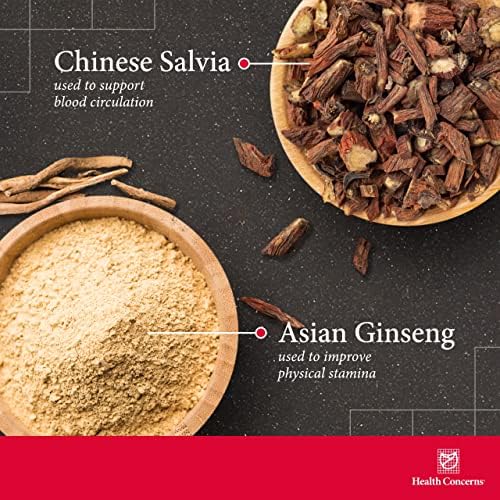 Ingredients include Chinese Salvia root (dan shen), Asian Ginseng root (ren shen), Astragalus root (huang qi), Rehmannia root (raw) (sheng di huang), Ginger rhizome (gan jiang), Dong Quai root (dang gui), Chinese Peony root (bai shao), Fo-Ti root (he shou wu), Sichuan Lovage root extract (chuan xiong), Bai-Zhu Atractylodes rhizome (bai zhu), Tangerine peel extract (chen pi), Sweet Wormwood aerial (ai ye), Licorice root extract (gan cao). Other Ingredients: Hypromellose (vegetable cellulose) and rice bran.
