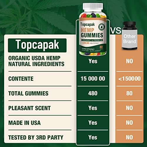 All Natural Ingredients : TOPCAPAK’s hemp gummies contain high quality Hemp Oil, Omega 3, Omega 6, Omega 9, Fiber, Vitamin E, Vitamin C.