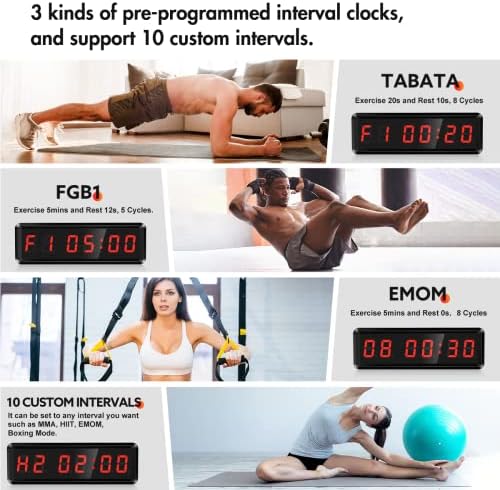 【Pre-programmed workout clock】: Built in 3 programmed interval modes, the gym timer is designed to provide the greatest help for your exercise. Tabata: 8 groups (20 seconds for each group , 10 seconds for each rest). FGB1: 5 groups (5 minutes for each group and 12 seconds for each rest). FGB2: 3 groups (5 minutes for each group and 20 seconds for each rest).