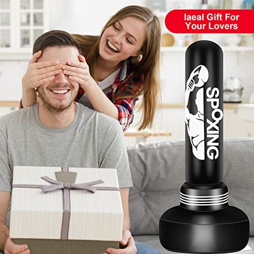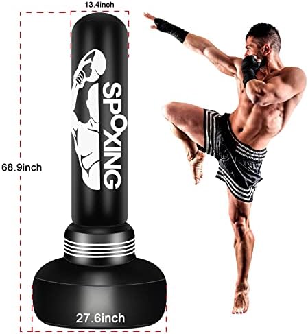 【100,000 Heavy Punches Tested】: This punching bag equipment is made of high-quality PVC, which is thick, durable, and elastic. The standing heavy bag has been tested with 100,000 heavy punches and will quickly bounce back after being hit/kicked. The punching bag is also soft, making it safe for children.