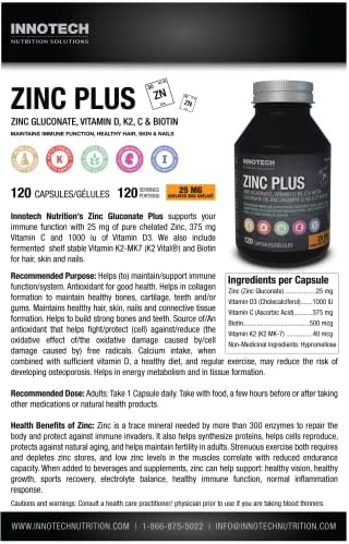 ZINC PLUS – Zinc, Gluconate, Vitamin D, K2, C & Biotin – supports your immune function with 25 mg of pure chelated Zinc, 375 mg Vitamin C and 1000 iu of Vitamin D3. We also include fermented shelf stable Vitamin K2-MK7 (K2 Vital) and Biotin for hair, skin and nails.
