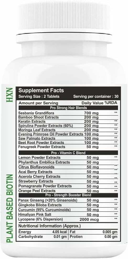 PLANT-BASED BIOTIN SUPPLEMENTS – Biotin (vit b7) is derived from natural sesbania extracts to enrich healthy hair . Apart from this Biotin also supports Energy and Fat Metabolism