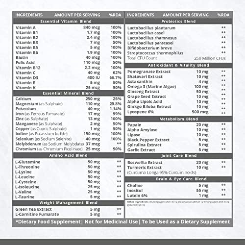 HEAD TO TOE WELLNESS BLEND: Multivitamin with Probiotics is a super blend comprising 10+ natural extracts & over 8+ essential blends. Ingredients like Green Tea, Shatavari, Pomegranate, Astaxanthin, Grapeseed, Ginseng, Ginkgo biloba & more power up every cell in the body so that you feel nourished right from head to toe.