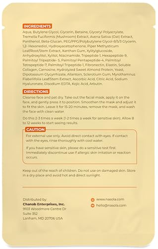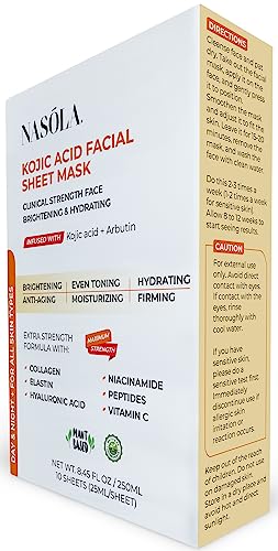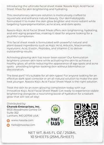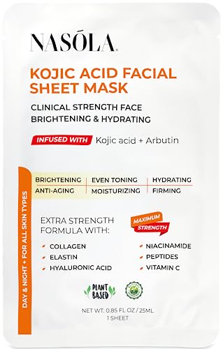 Experience the power of natural beauty with Nasola Kojic Acid Facial Sheet Mask. This revolutionary skin brightening and revitalizing facial sheet mask is packed with an advanced blend of Kojic Acid, Arbutin, Collagen, Elastin, Hyaluronic Acid, Niacinamide, Peptides, and Vitamin C to give the skin’s complexion the ultimate spa-quality treatment. Nasola Kojic Acid Facial Sheet Mask is a must-have for anyone (women and men) wanting to achieve glowing, even-toned, youthful-looking skin. Our facial mask sheet is made with premium quality ingredients that are carefully selected to provide the best results for your skin. This skin brightening sheet mask is packed with Kojic Acid and Arbutin, natural ingredients that brighten skin tone. It also contains Collagen and Elastin that help improve skin elasticity and firmness, making the skin look younger and more radiant. As an anti-aging beauty mask, our skincare sheet mask is infused with Hyaluronic Acid and Niacinamide that provide intense hydration, leaving the skin soft, supple, and moisturized. Nasola Kojic Acid Facial Sheet Mask is perfect for men and women who want to pamper themselves with a luxurious beauty face mask sheet. It is super easy to use; apply the mask to the face and let it sit for 15-20 minutes. This sheet mask is gentle and suitable for all skin types. And because it’s only made from plant-based and natural ingredients, it’s safe and gentle enough for everyday use. With regular use, our moisturizing facial mask will help anyone achieve brighter, more even-toned, and youthful-looking skin. With ten face sheet masks in every pack, anyone can enjoy professional quality results at home or on the go in just minutes. The mask sheets are carefully packed to remain fresh and effective. Experience the best of skin care with Nasola Kojic Acid Facial Sheet Mask. Order today and achieve glowing, youthful-looking skin.