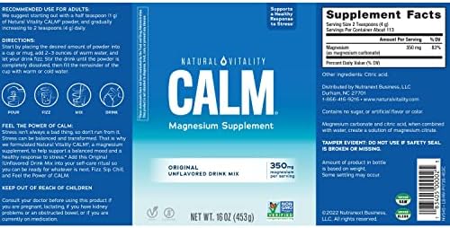 Natural Vitality CALM Magnesium Supplement Drink Mix is a convenient powder drink mix that helps support healthy magnesium levels while delivering a calming experience you can feel (1). Formulated with magnesium carbonate and citric acid, Natural CALM magnesium powder combines with water to create a magnesium citrate solution, which is better absorbed than magnesium oxide. Help manage stress, release tension and calm your mind with this magnesium drink (1). These vegan, gluten-free, unflavored magnesium supplements contain no sugar, artificial flavor or synthetic color. Simply mix this powder drink mix with water for a fizzy beverage you can enjoy hot, cold, day, night or anytime you could use a calm moment. (1) These statements have not been evaluated by the Food and Drug Administration. This product is not intended to diagnose, treat, cure or prevent any disease.