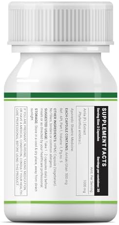 POWERHOUSE VITAMIN C: 100% pure and natural Amla (also known as Indian Gooseberry) fruit extract capsules. Also know as powerhouse of Vitamin C. Naturally increases Vitamin C and Antioxidants, Restore Energy and rejuvenate overall health. HIGH IN VITAMIN C: Amla is one of the highest natural sources of Vitamin C. A truly all-natural solution to get Vitamin C. Our Amla capsules does contain fillers, binders, common allergens, and additives. AMAZING BENEFITS: Amla is a potent antioxidant that helps to fight against free radicals, strengthens the body’s natural defense system, optimizes resistance power, and boosts the overall immune system. OPTIMAL USAGE: 1000mg/serving – 60 vegetarian capsules. Easy to swallow size 0 capsules. Our natural Vitamin C supplement (Amla extract) comes in vegetable capsule. Take 1-2 capsules daily before meals or as advised by your healthcare professional. PREMIUM QUALITY: Our product contains the most natural and effective formulation of trusted natural ingredients that are carefully processed and manufactured in a GMP certified manufacturing facility so you can be sure that you are safe. OPTIMAL USAGE: Easy to swallow size 0 capsules. Our natural Vitamin C supplement (Amla extract) comes in vegetable capsule. Take 1-2 capsules daily before meals or as advised by your healthcare professional. PREMIUM QUALITY: Our product contains the most natural and effective formulation of trusted natural ingredients that are carefully processed and manufactured in a GMP certified manufacturing facility so you can be sure that you are safe.