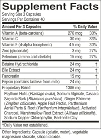 DIGESTIVE ENZYMES – Effective amounts of pepsin, pancreatin, and bile salts assist the body in digesting a variety of foods including common proteins and fats.