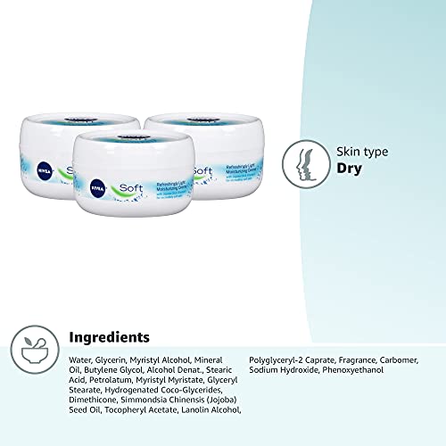 Includes three (3) 6.8 ounce jars of NIVEA Soft, Refreshingly Soft Moisturizing Cream