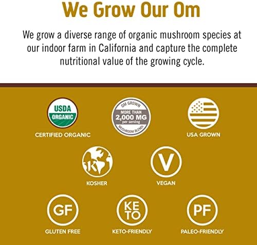 USA Grown the Om Way: Om Mushroom Superfood Powders, Capsules, Hot Drinks, Energy Drinks and Broths are all produced in the USA. We grow, dry and mill our organic mushrooms into powders in our state of the art facilities in Southern California, to ensure the highest quality, and verify using 3rd-Party Testing. Om Mushroom powders are USDA Certified 100% organic, non-GMO, gluten-free, vegan, grown in the USA, paleo-friendly, keto-friendly, kosher