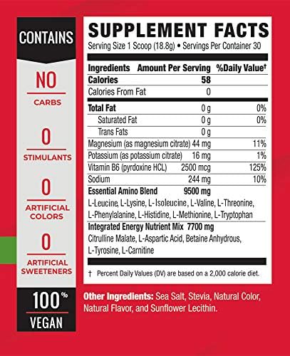 Product Features 9.5g of Fermented Essential Amino Acids 7.7g of a Natural Integrated Energy Mix Clean Tasting, Easy Mixing and Fully Dissolving Naturally Sweetened and Flavored Zero Artificial Sweeteners, Colors, and Flavors No Carbs No Stimulants 100% Vegan