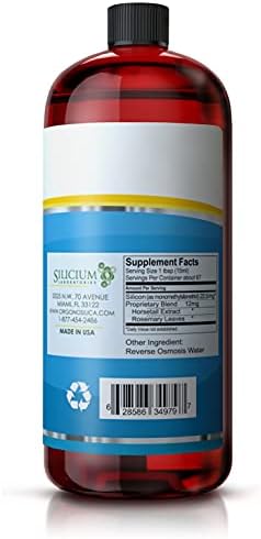 Size 33.8 FL OZ (1.05 QT) 1L Serving SIze 1 Tbsp ( 15mL ) Servings per Container 67 INGREDIENTS Silicon (as Living Silica) 22.5 mg* / PROPRIETARY BLEND (Horsetail Extract * / Rosemary Leaves*) 12mg / Reverse Osmosis Water * Daily Value Not Established CAUTION Do not use if safety seal is damaged or missing. If pregnant, nursing, or on medication consult with your health care practitioner prior to use. SUGGESTED USE Adults, as a dietary supplement, take one (1) tablespoon daily, preferably before meals. Store sealed bottle up to three years at 59-86 degrees F (15-30°C). Once opened, store bottle in the refrigerator up to three months. LOT / EXPIRATION: SEE BOTTOM OF THE BOTTLE.
