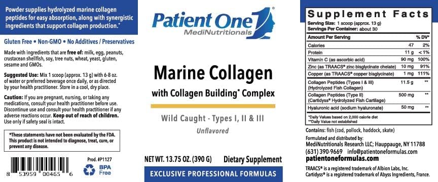 COLLAGEN BUILDING COMPLEX: The body makes collagen by combining amino acids. Because the process also requires vitamin C, zinc and copper, Patient One Marine Collagen includes these important co-factors.