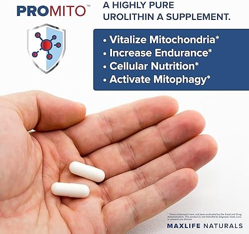ProMito Urolithin-A – MADE IN THE USA – and is produced in a facility using the latest GMP qualifications by Maxlife Naturals, and always 3rd party batch tested to insure quality and potency of all finished products.