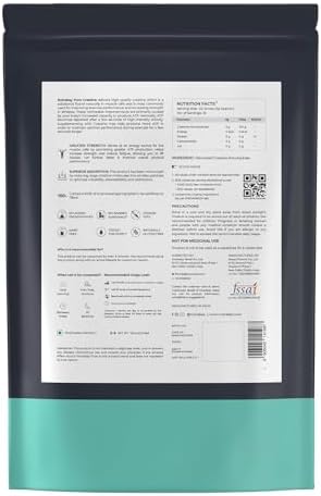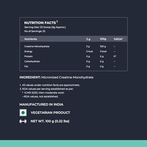 Creatine is 100% Pure Creatine, Vegan Friendly with No Artificial Colour, No fillers, No Added Sugar and No Banned Substances. Gluten Free, Dairy Free, Steroid Free, Tested for purity.; ABSORPTION : This product has been micronized by reducing large creatine molecules into smaller particles to optimize mixability, bioavailability and absorption.