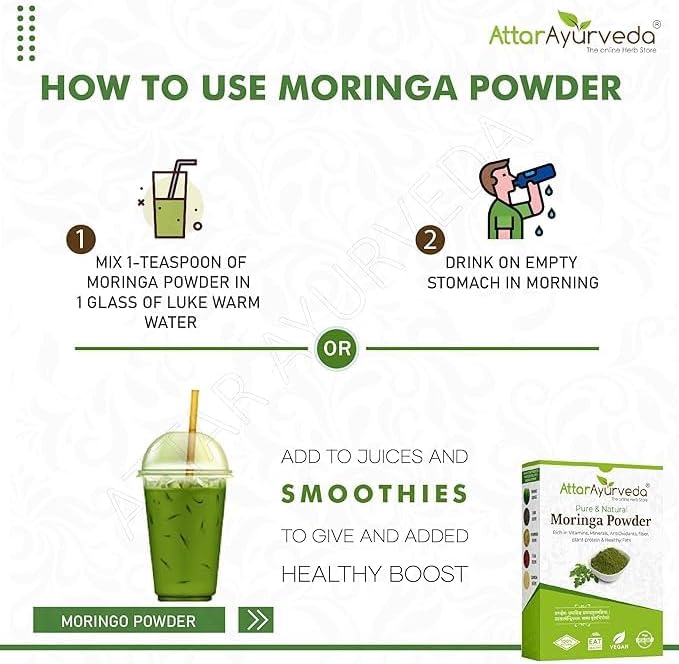 Moringa powder is prepared from high quality Moringa leaves and doesn’t contain any preservative, Moringa Powder doesnt contain any kind of preservatives added to it. Moringa Powder is 100% Vegan friendly Moringa Powder is naturally grown without any use of GMO techniques, so that you can be sure of what are you putting in your body,Add almond milk, moringa, and frozen banana to a high-speed blender.Process until the smoothie is smooth and creamy. Serve immediately.Add all ingredients to a large bottle or glass jug. Leave to sit for at least 2 hours in the fridge before serving with plenty of ice.The simplest way to use moringa is by mixing 1tsp of Moringa Powder in 1 glass of water.Make sure to mix it thoroughly, as moringa is light in weight, hence doesn’t mix with water readily. was founded with the motive to provide wellness via Natural means. At , Your health and well-being are our highest priority, and everything we do is managed with that in mind. It’s important to note that adheres to the industry-accepted practice of organoleptic testing for the proper identification of our products.