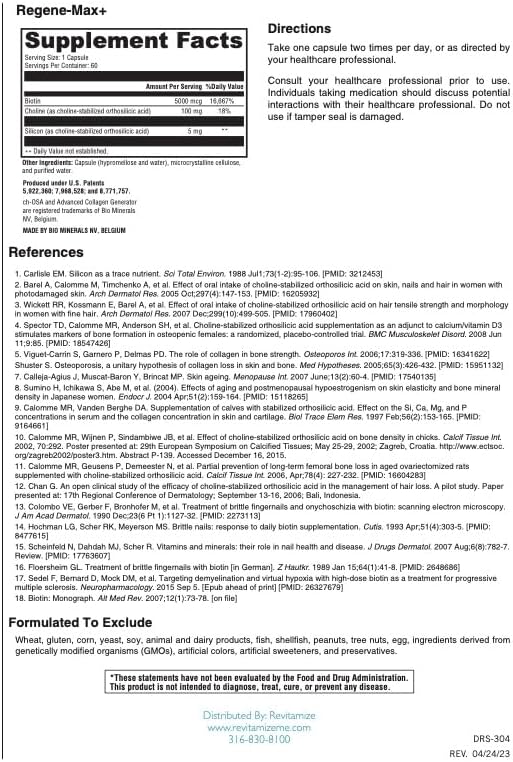 Reduces Fine Lines and Wrinkles* Thickens and Strengthens Hair* Strengthens Nails* Supports Healthy Bone Mineral Density* Supports Bone Flexibility* Promotes Connective Tissue Formation for Healthy Joints* Regene-Max+ features clinically tested ch-OSA (choline-stabilized orthosilicic acid) complemented with biotin. ch-OSA naturally helps nourish your body’s beauty proteins by supporting and activating enzymes used by collagen-generating cells to make collagen. Regular orthosilicic acid (OSA) has to be stabilized to avoid polymerization, a process that decreases bioavailability. ch-OSA’s patented choline-stabilization technology prevents polymers from forming and ensures OSA’s optimal absorption. By combining ch-OSA with biotin, Regene-Max+ offers an even greater level of beauty support.* All Revitamize Formulas Meet or Exceed cGMP Quality Standards Silicon and Choline-Stabilized Orthosilicic Acid Silicon is a ubiquitous element present in various tissues of the human body. It performs an important role in connective tissue health, especially in the formation of the organic matrix (e.g., collagen and glycosaminoglycan formation).[1] Cereal/grain-based products and vegetables are the main dietary sources of silicon, but modern processing is likely to reduce intake from these sources. Soluble silicon is found as orthosilicic acid (OSA) in beverages and water.[2] Because regular orthosilicic acid is highly unstable, leading it to form polymers, and because the polymers are too large for the human body to absorb, Regene-Max+ features patented “choline stabilization” technology. This stabilization prevents polymers from forming, ensuring optimal absorption of orthosilicic acid. Choline-stabilized orthosilicic acid (ch-OSA) is a bioavailable form of silicon that has been found to increase the hydroxyproline concentration in the dermis of animals.[2] Furthermore, the ch-OSA in Regene-Max+ is clinically proven for your assurance.*[2-4] “Beauty Proteins” and O