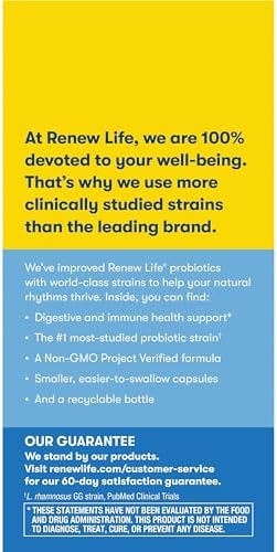 Renew Life Extra Care Digestive Probiotic offers 12 probiotic strains in easy-to-swallow capsules to promote immune, respiratory and digestive health (1). Featuring more clinically studied strains than the leading brand (2), these men’s and women’s probiotic pills contain a blend of 12 different probiotic strains including L. rhamnosus GG, the No. 1 most studied strain (3). With 50 billion cultures, these Renew Life probiotic capsules make it easy to support digestive, respiratory and immune health. Each strain is clinically tested and formulated by microbiologists and researchers to offer science-backed benefits. Potency, quality and purity are guaranteed through the expiration date. This Non-GMO Project Verified daily probiotic supplement comes in small, easy-to-swallow capsules that are gluten-free, dairy-free and soy-free. Renew Life puts health and wellness first with supplements that are backed by over 25 years of clinical trials. (1) These statements have not been evaluated by the Food and Drug Administration. This product is not intended to diagnose, treat, cure or prevent any disease. (2) Based on IRI unit sales data, January 2021. (3) L. rhamnosus GG strain, PubMed Clinical Trials, August 2019.