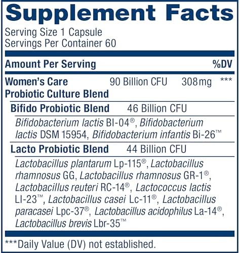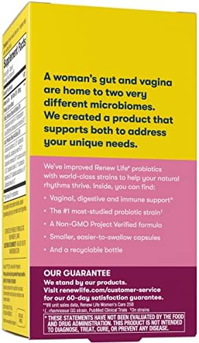 Renew Life Women’s Probiotic Capsules offers 12 probiotic strains to help maintain healthy vaginal bacteria and yeast levels, and support urinary, digestive and immune health (1). Featuring more clinically studied strains than the leading brand (2), these vaginal probiotics contain a blend of 12 different probiotic strains including L. rhamnosus GG, the No. 1 most studied strain (3). With 90 billion cultures, these Renew Life probiotic capsules make it easy for you to support your vaginal, urinary, digestive and immune health. Each strain is clinically tested and formulated by microbiologists and researchers to offer science-backed health benefits you can enjoy every day. Potency, quality and purity are guaranteed through the expiration date. This daily probiotic supplement offers a Non-GMO Project Verified formula that is gluten-free, dairy-free and soy-free. Renew Life puts health and wellness first with supplements that are backed by over 25 years of clinical trials. (1) These statements have not been evaluated by the Food and Drug Administration. This product is not intended to diagnose, treat, cure or prevent any disease. (2) Based on IRI unit sales data, January 2021. (3) L. rhamnosus GG strain, PubMed Clinical Trials, August 2019.