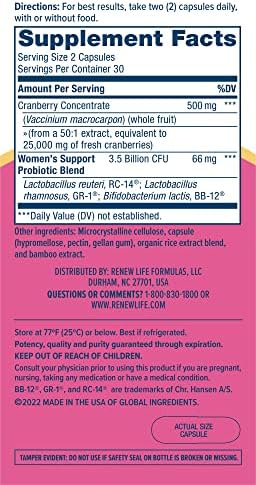 Renew Life Women’s Wellness Vaginal and Urinary Complete Probiotic and Cranberry Supplement is a probiotic supplement with cranberry to support urinary tract, digestive and immune health (1). Formulated with a Women’s Support Probiotic Blend and 500 mg of cranberry concentrate, this womens health probiotic feeds your microbiome, promotes the growth of good bacteria, and supplies a clinically studied level of cranberry to help support healthy urinary tract function (1)(2). Each serving of these Renew Life probiotic gummies contains 2 Billion cultures that are tough enough to survive stomach acid. Renew Life vaginal probiotics help support your urinary, digestive and immune health every day. Adults, take two capsules per day with or without food. Renew Life puts womens wellness first with supplements that are backed by over 25 years of clinical trials with women. (1) These statements have not been evaluated by the Food and Drug Administration. This product is not intended to diagnose, treat, cure or prevent any disease. (2) Limited scientific evidence shows that by consuming 500 mg each day of cranberry dietary supplement, healthy women who have had a urinary tract infection (UTI) may reduce their risk of recurrent UTI. (3) NCBI National Library of Medicine.