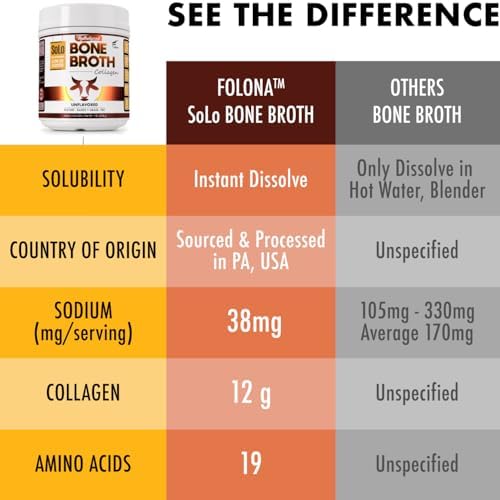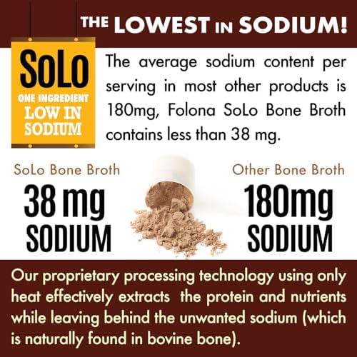 LOW IN SODIUM – The average sodium content per serving in most other products is 180 mg, Folona SoLo Bone Broth contains less than 0.1 mg. Our proprietary processing technology using only heat effectively extracts the protein and nutrients while leaving behind the unwanted sodium (which is naturally found in bovine bones)