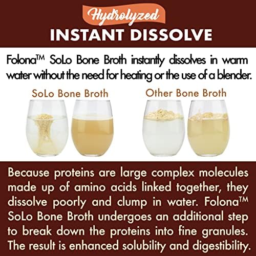 INSTANTLY DISSOLVE – NO BLENDER needed – Because proteins are large complex molecules made up of amino acids linked together, they dissolve poorly and clump in water. Our Bone Broth is 100% HYDROLYZED, the process where naturally-occurring enzymes are used to break down the proteins into smaller peptides. The hydrolyzation allows the proteins to dissolve instantly in cold water without the use of a blender, it also helps our body better digest and absorb the protein.