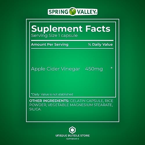 Support your overall health and wellness with our Spring Valley Apple Cider Vinegar Capsules. Apple Cider Vinegar has been used for centuries as an herbal supplement. Each capsule of Spring Valley’s expertly crafted Apple Cider Vinegar contains 450mg of this traditional ingredient. The suggested serving size for adults is one capsule, three times a day, preferably taken with meals and plenty of water, for a total of three capsules daily. It is suggested that, when first using Spring Valley’s Apple Cider Vinegar Capsules, adults assess tolerance by starting with one capsule daily. Spring Valley Apple Cider Vinegar Capsules are free of yeast, wheat, milk or milk derivatives, lactose, and sugar and also do not contain any preservatives, artificial colors, or artificial flavors. You can rest assured that Spring Valley Apple Cider Vinegar Capsules is a dietary supplement that is produced with strict quality guidelines.