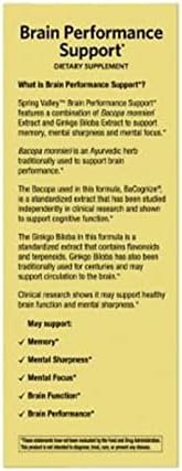 Spring Valley Brain Performance Support* features a combination of bacopa monnieri and ginkgo biloba extracts to support memory, mental sharpness, and mental focus.* Bacopa monnieri is an Ayurvedic herb traditionally used to support brain performance.* The bacopa used in this formula, BaCognize, is a standardized extract that has been studied independently in clinical research and shown to support cognitive function.* The ginkgo biloba in this formula is a standardized extract that contains flavonoids and terpenoids. Ginkgo biloba has also been traditionally used for centuries and may support circulation to the brain.* Clinical research shows it may support healthy brain function and mental sharpness.* These vegetarian capsules contain no gluten, yeast, wheat, lactose, soy, artificial preservatives, colors, or flavors. The recommended dosage is 2 capsules daily with food. You can rest assured that Spring Valley Brain Performance Support* Capsules Dietary Supplement is produced with strict quality guidelines and backed by our quality guarantee. Spring Valley understands living a healthy, balanced lifestyle is the key to being your best self. With an affordable range of products inspired by nature, Spring Valley supports your and your family’s health and holistic well-being.