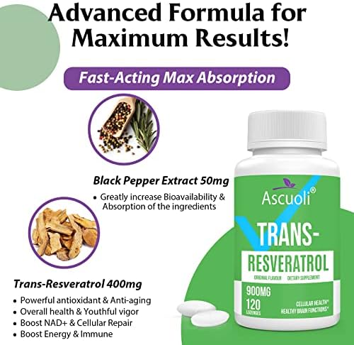 【3-IN-1 for Maximum Results!】 Ascuoli Trans-Resveratrol 900mg + Black pepper extract 50mg: As we age, NAD+ levels fall, it helps boost NAD+ levels to slow the aging process, repair DNA and generate cell energy. Trans-resveratrol is a proven antioxidant supplement that promotes overall health. Black pepper extract can greatly increase bioavailability and absorption of the ingredients. Stack 3 ingredients together for max results!
