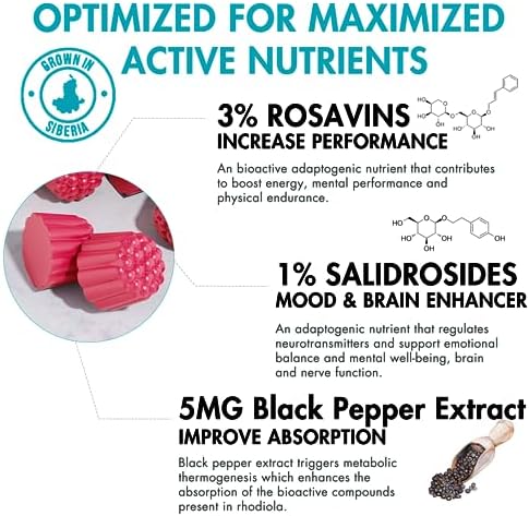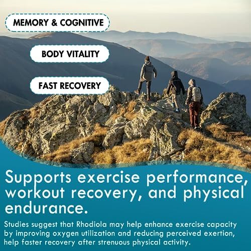 Increas Energy & Immune System: Rhodiola rosea propels your energy levels, augmenting endurance and athletic performance by optimizing oxygen utilization and bolstering ATP production. The inclusion of Vitamin E and Vitamin C imparts antioxidant capabilities, safeguarding cells from the effects of oxidative stress induced by free radicals. Furthermore, they promote digestive well-being and fortify the immune system. Elevate your vitality with the natural energy enhancer – Rhodiola rosea!