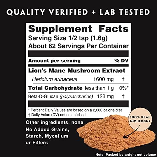 Real Mushrooms & Quality Verified: Unlike other Lions Mane mushroom supplement for memory and focus, our Lions Mane powder is dual extracted with water and alcohol using only mushroom fruiting bodies. No added mycelium, starch, grains or fillers–only 100% real mushrooms. Our unique process creates a Lions Mane extract powder rich in immune boosting beta glucans–the most important compound in mushrooms. Every product is tested and verified for quality and potency by third-party laboratories.